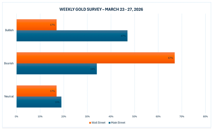 Khảo sát trực tuyến với 309 nhà đầu tư cho thấy tâm lý cũng đã chuyển sang xu hướng tiêu cực rõ rệt. 147 người (chiếm 47%) vẫn kỳ vọng giá vàng tăng, trong khi 104 người (chiếm 34%) dự báo giá sẽ giảm. Số còn lại 58 nhà đầu tư (chiếm 19%) cho rằng kim loại quý sẽ đi ngang tuần tới.