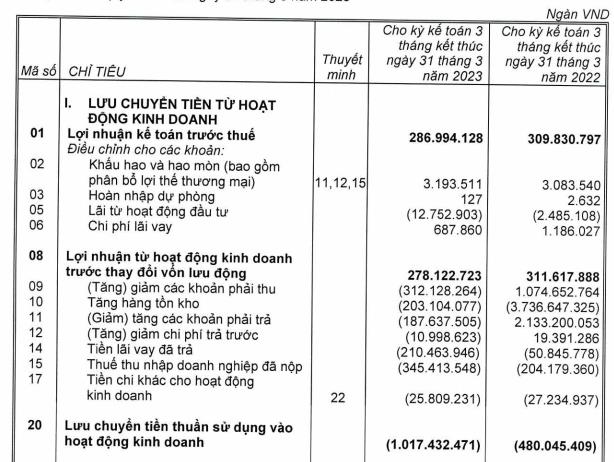 Quý 1/2023 dòng tiền kinh doanh âm nặng, lãi giảm mạnh