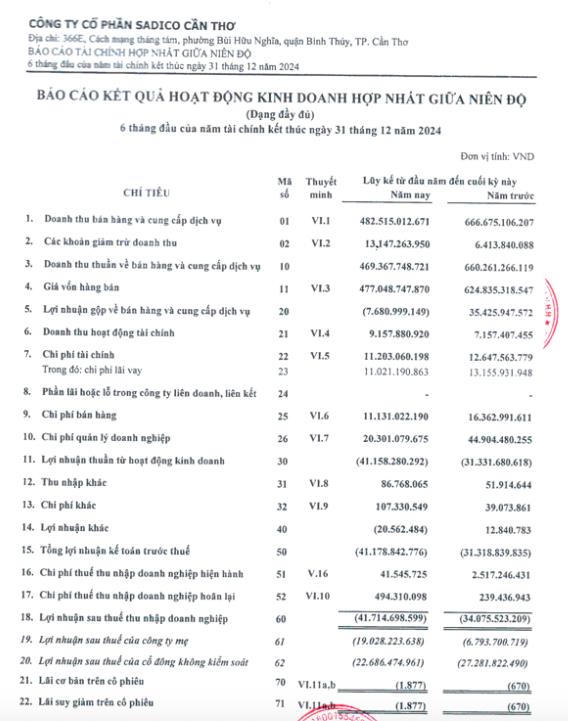 Về hoạt động kinh doanh, theo báo cáo kinh doanh hợp nhất nửa đầu năm 2024, SDG mang về doanh thu thuần 469,3 tỷ đồng, giảm 29% so với cùng kỳ. Lợi nhuận gộp báo lỗ 7,6 tỷ đồng trong khi cùng kỳ lãi 35,4 tỷ đồng.