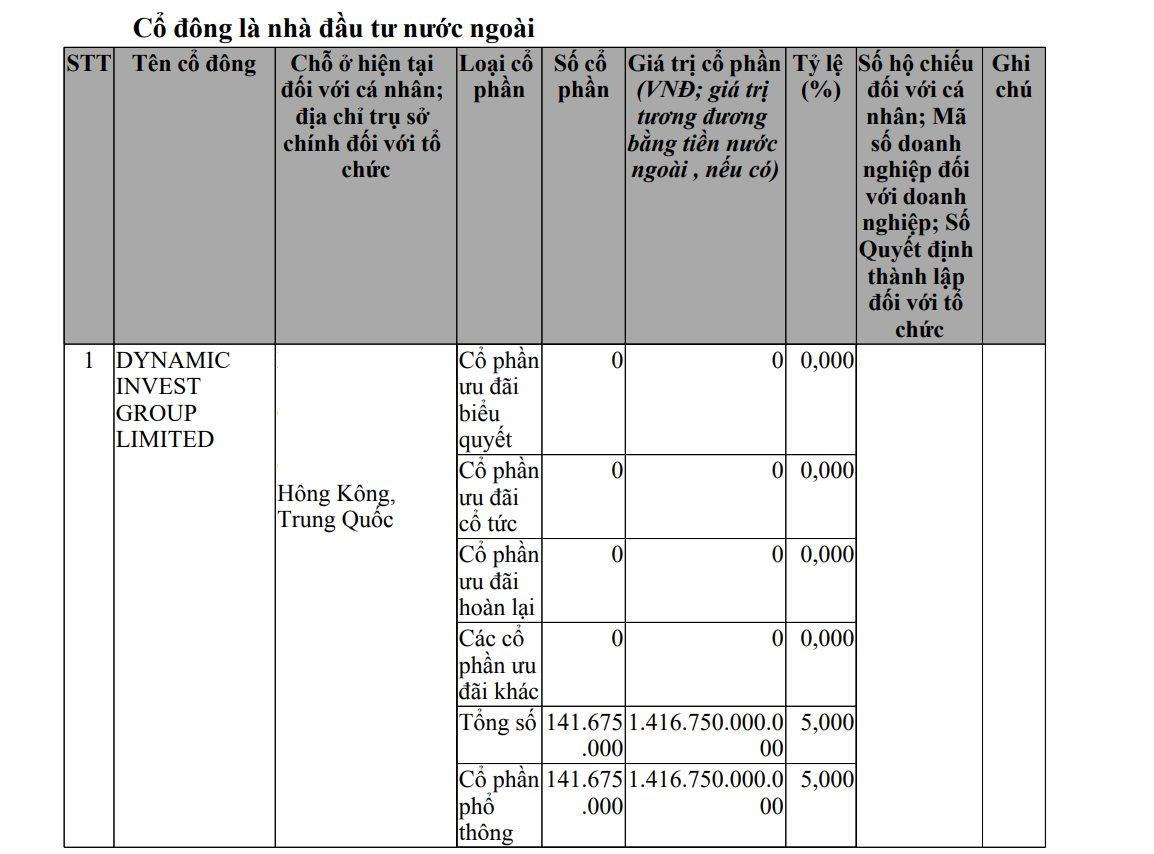 CTCP Năng lượng VinEnergo (thành lập tháng 3/2025) vừa công bố thông tin cập nhật vào ngày 15/11. Theo đó, doanh nghiệp hiện có 1 cổ đông là nhà đầu tư nước ngoài, sở hữu 1.416,8 tỷ đồng, tương đương 5% cổ phần. Cổ đông này là Dynamic Invest Group Limited, có địa chỉ tại Hong Kong, Trung Quốc, một cái tên từng xuất hiện trong hệ sinh thái Vingroup.