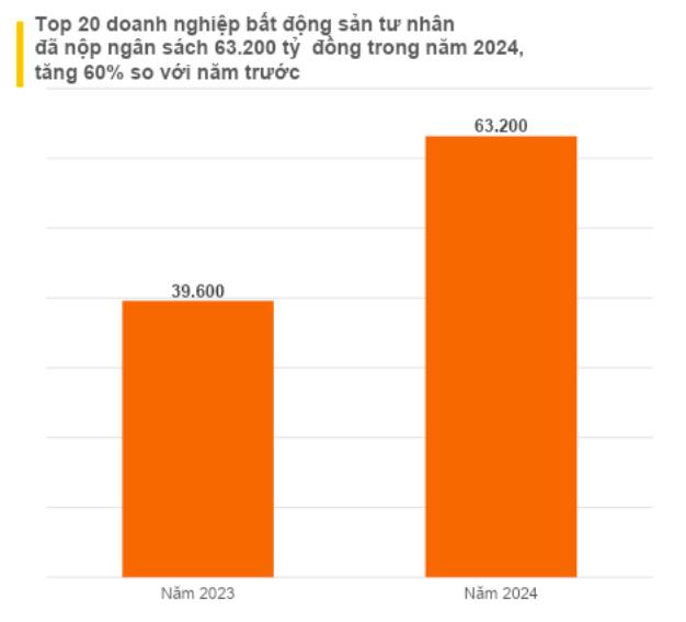 Trong nhóm 20 doanh nghiệp đứng đầu ngành bất động sản tư nhân, có tới 13 đơn vị nộp ngân sách vượt mốc 1.000 tỷ đồng. Tổng giá trị nộp ngân sách của nhóm này đạt 63.200 tỷ đồng, tăng 23.600 tỷ đồng so với năm 2023, tương đương mức tăng trưởng 60%.