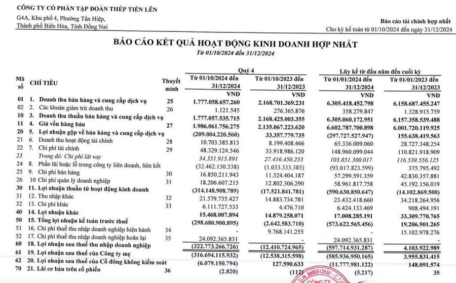 Về bức tranh tài chính, theo báo cáo kinh doanh hợp nhất quý IV/2024, Thép Tiến Liên ghi nhận doanh thut huần đạt 1.777 tỷ đồng, giảm 18% so với cùng kỳ năm trước.