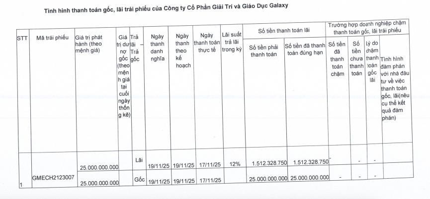 Theo đó, ngày 17/11/2025, Galaxy EE đã thanh toán 25 tỷ đồng tiền gốc và hơn 1,5 tỷ đồng tiền lãi cho lô trái phiếu mã GMECH2123007, qua đó tất toán lô trái phiếu này đúng hạn.