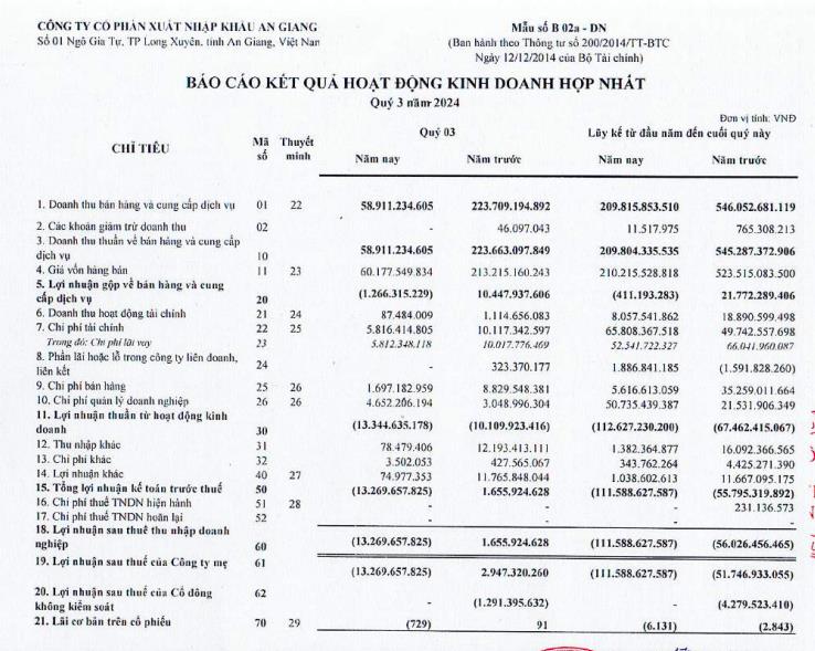 Về tình hình hoạt động sản xuất kinh doanh, theo báo cáo tài chính quý III/2024, Angimex đạt doanh thu thuần 58,9 tỷ đồng, giảm 73% so với quý III/2023.