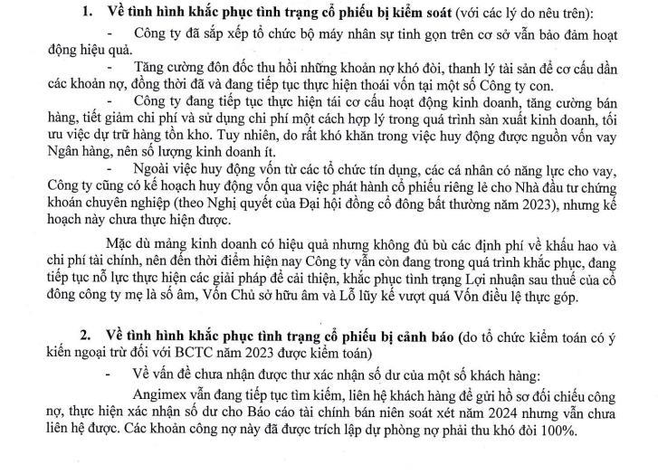 Về tình hình khắc phục tình trạng cổ phiếu bị cảnh báo, Angimex vẫn chưa liên hệ được với khách hàng để gửi hồ sơ đối chiếu công nợ, thực hiện xác nhận số dư cho báo cáo tài chính bán niên soát xét năm 2024. Do đó, các khoản công nợ này buộc phải trích lập dự phòng nợ phải thu khó đòi 100%.