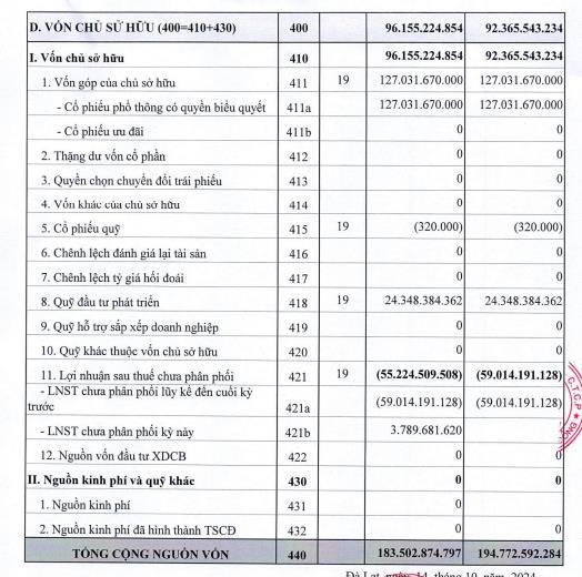 Dù kết quả 9 tháng đã có cải thiện hơn so với cùng kỳ nhưng Dược Lâm Đồng vẫn đang ghi nhận lỗ lũy kế 55,2 tỷ đồng tính đến ngày 30/9/2024. Khoản lỗ này đã phần nào bào mòn đi lượng lớn tài sản khiến vốn chủ của doanh nghiệp chỉ còn 96,2 tỷ đồng.