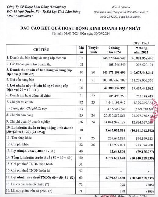 Về hoạt động kinh doanh, theo báo cáo tài chính hợp nhất, tính chung 9 tháng đầu năm, Ladophar ghi nhận doanh thu thuần đạt 146,1 tỷ đồng, tăng 4% so với cùng kỳ năm ngoái.