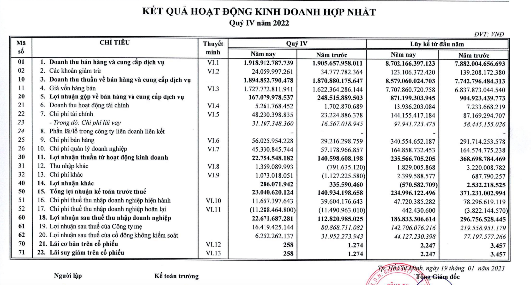 Trừ các khoản chi phí, lợi nhuận trước thuế quý IV/2022 của doanh nghiệp còn đạt 23 tỷ đồng, giảm 83% so với quý IV/2021.
