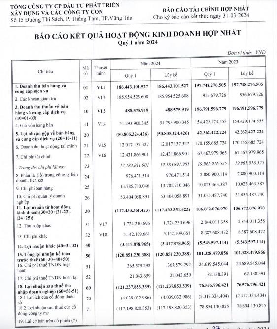 Về kết quả kinh doanh, theo báo cáo tài chính hợp nhất quý I/2024, trong 3 tháng đầu năm, Công ty ghi nhận doanh thu thuần đạt 488,5 triệu đồng, thấp hơn rất nhiều so với con số 197 tỷ đồng đạt được ở cùng kỳ năm ngoái.