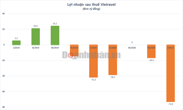 Chi phí quản lý doanh nghiệp cũng 8,5% lên 61,8 tỷ đồng trong khi chi phí bán hàng được tiết giảm 31% nhưng chỉ chiếm tỷ trọng nhỏ với gần 6,5 tỷ đồng. Kết quả, Vietravel lỗ sau thuế hơn 72,8 tỷ đồng, con số cao nhất công ty từng ghi nhận trong một quý kể từ khi lên sàn năm 2019. Khoản lỗ này đã đào sâu thêm lỗ luỹ kế của Vietravel lên mức 102,2 tỷ đồng thời điểm cuối tháng 3/2021.