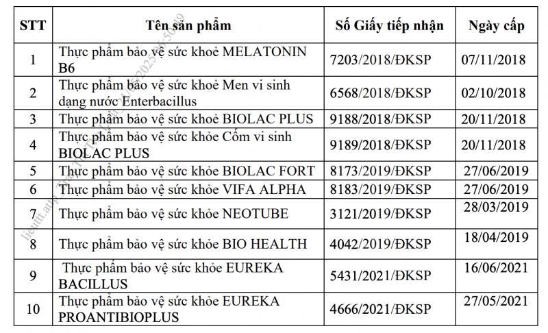 Cụ thể, CTCP Công nghệ sinh phẩm Nam Việt (địa chỉ tại lô A3 - A4, Cụm Công nghiệp vừa và nhỏ, xã Diên Phú, huyện Diên Khánh, tỉnh Khánh Hòa) đã có văn bản gửi Cục An toàn thực phẩm xin rút hồ sơ liên quan đến các sản phẩm TPBVSK. Căn cứ theo đề nghị của doanh nghiệp, Cục đã ra quyết định thu hồi hiệu lực các Giấy tiếp nhận đăng ký bản công bố tương ứng.