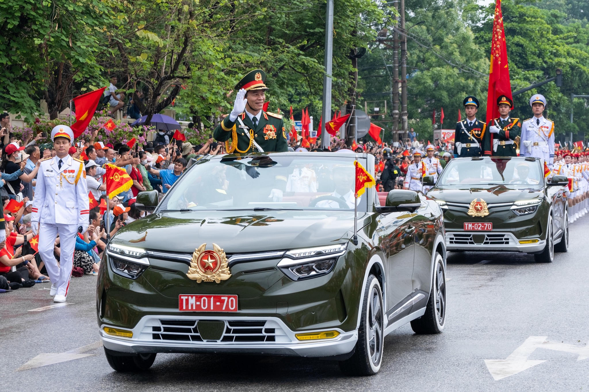Đoàn diễu binh, diễu hành có tổng cộng 4 chiếc VF 8 mui trần, 2 chiếc được sản xuất theo yêu cầu của Bộ Quốc phòng và 2 chiếc của Bộ Công an. Cả 4 chiếc xe sở hữu thiết kế kết hợp hài hòa giữa thiết kế hiện đại sang trọng và nét truyền thống Việt với các chi tiết sơn trắng gợi nhớ hình ảnh những chiếc xe chiến đấu trên chiến trường năm xưa.