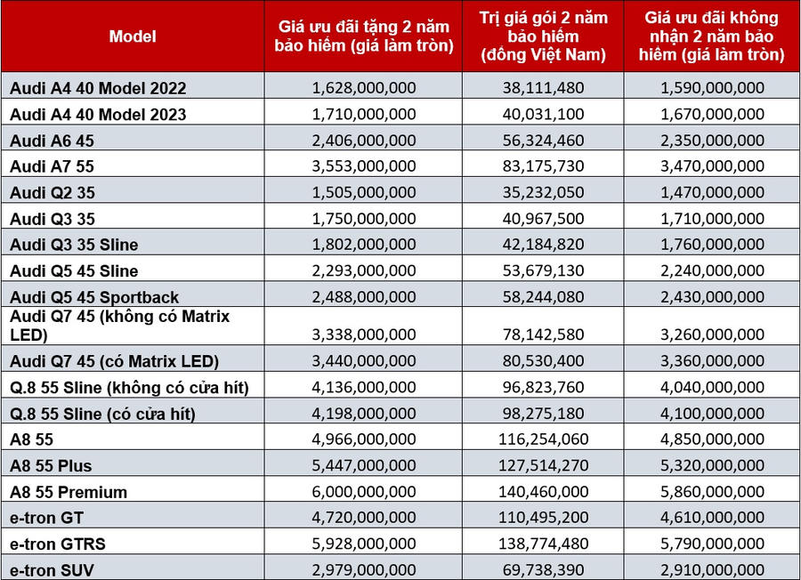 Các mẫu xe thuộc diện ưu đãi này gồm A4, A6, A7, A8, Q2, Q3, Q5, Q7 và Q8, tức là gần hết danh mục sản phẩm. Tùy theo mẫu xe và phiên bản sẽ có mức giảm khác nhau.