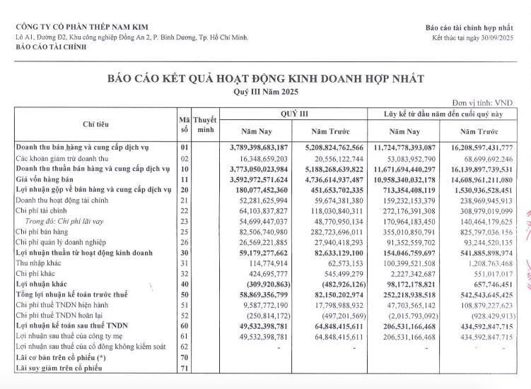 Theo đó, trong quý III/2025, Thép Nam Kim ghi nhận doanh thu thuần đạt 3.773 tỷ đồng, giảm 27,3% so với cùng kỳ năm ngoái.