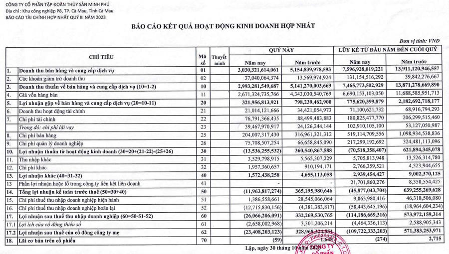 Lý giải việc kinh doanh thua lỗ trong quý III/2023, Tập đoàn Thủy sản Minh Phú cho biết kết quả kinh doanh kém đến từ việc doanh thu bán hàng giảm. Ngoài ra, nguyên nhân khác đến từ việc kết quả hoạt động sản xuất kinh doanh của các công ty nuôi tôm thương phẩm như Công ty TNHH nuôi trồng thuỷ sản Minh Phú Lộc An, Công ty TNHH thuỷ sản Minh Phú Kiên Giang và Công ty TNHH Sản xuất giống thuỷ sản Minh Phú Ninh Thuận chưa có hiệu quả.