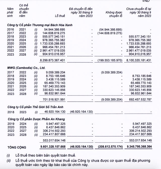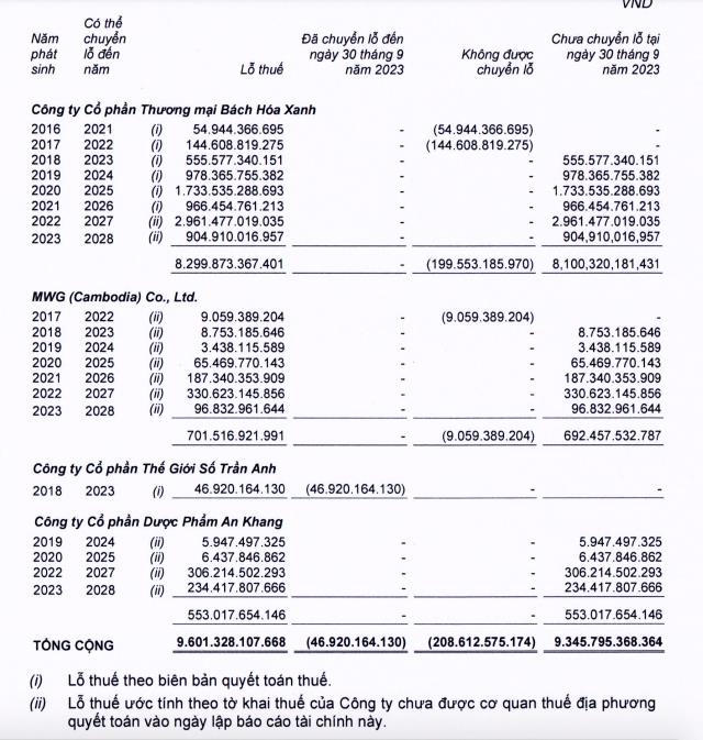 Ngoài ra, các đơn vị khác như Công ty cổ phần Bán lẻ An Khang báo lỗ 234,4 tỷ đồng, lũy kế từ năm 2019 tới nay đang lỗ 553 tỷ đồng; MWG (Cambodia) Co., Ltd ghi nhận lỗ 96,8 tỷ đồng, luỹ kế 9 tháng đầu năm 2023 ghi nhận lỗ 701,5 tỷ đồng…