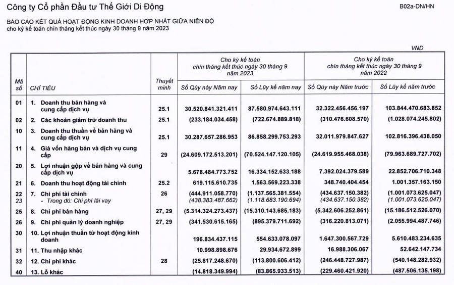 Luỹ kế trong 9 tháng đầu năm 2023, công ty Thế giới Di động ghi nhận doanh thu đạt 86.858 tỷ đồng, giảm 15,5% so với cùng kỳ. Lợi nhuận sau thuế ghi nhận 77,51 tỷ đồng, giảm 97,8% so với cùng kỳ.