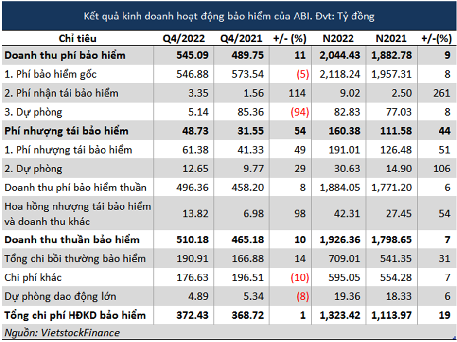 Mặc dù thoát lỗ trong quý 4, lợi nhuận ròng cả năm 2022 của ABI vẫn giảm 19% so năm trước, còn gần 222 tỷ đồng, chủ yếu do chi phí hoạt động kinh doanh bảo hiểm tăng mạnh hơn doanh thu bảo hiểm thuần.
