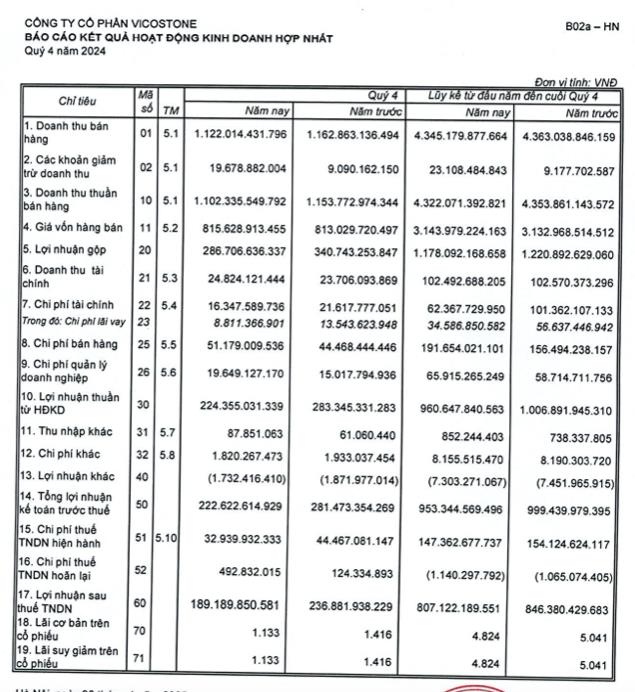 Công ty cổ phần Vicostone (mã ck: VCS) vừa công bố báo cáo tài chính hợp nhất quý IV/2024.