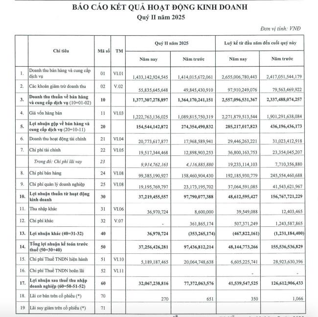 CTCP Cao su Đà Nẵng (mã ck: DRC) vừa công bố báo cáo tài chính quý II/2025 với doanh thu thuần đạt 1.377 tỷ đồng, tăng nhẹ so với cùng kỳ năm ngoái.
