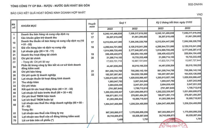 Khấu trừ đi các chi phí, Sabeco ghi nhận lãi ròng quý I/2023 ở mức 967 tỷ đồng, giảm 17% so cùng kỳ năm trước.