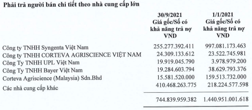 Theo báo cáo tài chính quý III/2021, Syngenta là nhà cung cấp lớn nhất của Lộc Trời với công nợ hơn 255 tỷ đồng, chiếm 1/3 tổng khoản phải trả người bán ngắn hạn tại thời điểm 30/9. Công nợ đối với nhà cung cấp này không được gối đầu và đã giảm mạnh gần 750 tỷ đồng từ đầu năm, tương đương với sự sụt giảm các khoản phải trả người bán ngắn hạn. Điều này cho thấy Lộc Trời vẫn chưa tìm được đối tác xứng tầm để thay thế dù đã có thời gian chuẩn bị cho sự chia tay này.