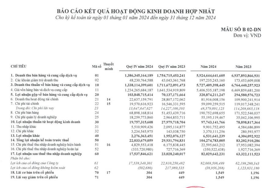 Tính chung cả năm 2024, Công ty mang về 5.727 tỷ đồng doanh thu thuần, giảm 15% so với cùng kỳ. PSD báo hơn 82 tỷ đồng lợi nhuận sau thuế, tăng hơn 30%, chủ yếu do giá vốn và chi phí tài chính được tiết giảm tốt.