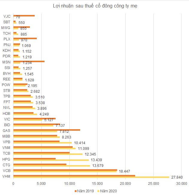 Xét về con số tuyệt đối, Vinhomes ( HoSE: VHM ) ghi nhận lợi nhuận cao nhất trong nhóm VN30 và cũng dẫn đầu trong số các doanh nghiệp trên thị trường chứng khoán, bỏ xa đơn vị đứng thứ 2 là Vietcombank. Lợi nhuận sau thuế cổ đông công ty mẹ năm 2020 của Vinhomes đạt 27.840 tỷ đồng, tăng 28% so với năm trước.