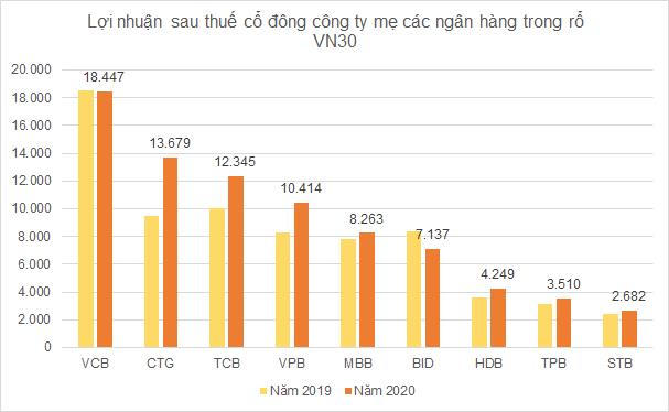 Lợi nhuận của 9 ngân hàng thuộc rổ VN30 ghi nhận mức tăng 13% lên 80.726 tỷ đồng trong năm 2020. Vietcombank và BIDV báo lợi nhuận giảm do tăng mạnh chi phí trích lập dự phòng rủi ro tín dụng.