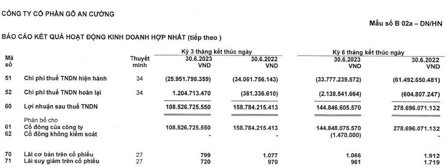 Lũy kế 6 tháng đầu năm, Gỗ An Cường ghi nhận doanh thu thuần 1.648,1 tỷ đồng, lãi sau thuế đạt 144,8 tỷ đồng, lần lượt giảm 13,8% và 48% so với nửa đầu năm ngoái.
