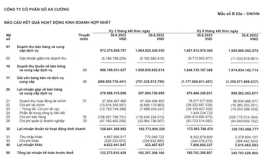 Về kết quả kinh doanh, trong quý II/2023 vừa qua, Gỗ An Cường ghi nhận doanh thu thuần 968,1 tỷ đồng, giảm 9% so với cùng kỳ.