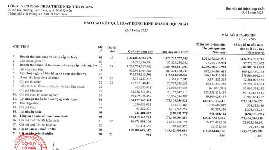 Báo cáo tài chính quý I/2023 của Công ty cổ phần Nhựa Thiếu niên Tiền Phong (mã CK: NTP) chỉ ra, trong 3 tháng đầu năm, doanh thu của NTP ghi nhận 1.299,7 tỷ đồng, tăng 19,8% so với cùng kỳ.