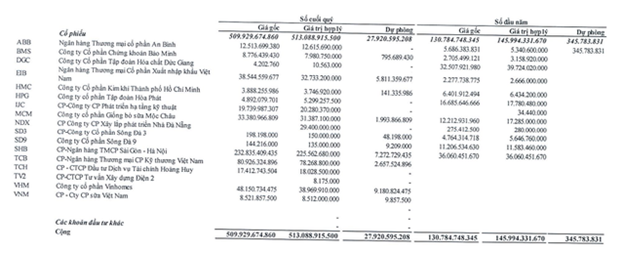 Khoản đầu tư có giá trị lớn nhất trong danh mục của Nhà Đà Nẵng là cổ phiếu SHB với giá thị trường gần 226 tỷ đồng. Ngoài ra, công ty bất động sản này còn nắm giữ các cổ phiếu TCB (78 tỷ đồng), VHM (78 tỷ đồng), EIB (33 tỷ đồng)...