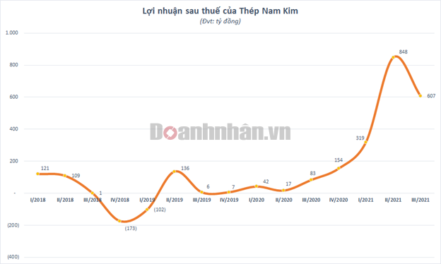 Quý III/2021, Thép Nam Kim lãi ròng 607 tỷ đồng, gấp 7,3 lần cùng kỳ nhưng giảm hơn 28% so với quý II trước đó.
