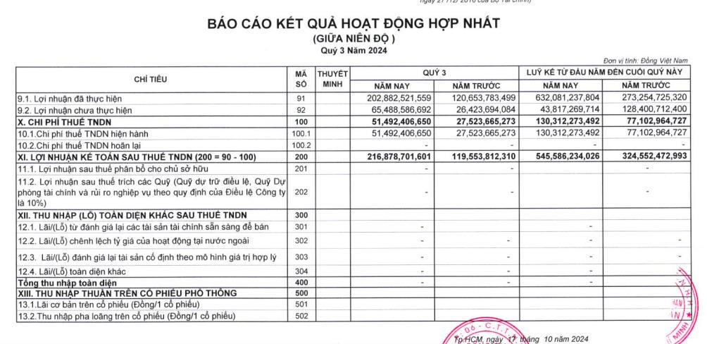 Với khoản lãi sau thuế quý III tăng vọt giúp thúc đẩy lãi lũy kế 9 tháng đầu năm 2024 lên 545,5 tỷ đồng, tăng 68% so với cùng kỳ.