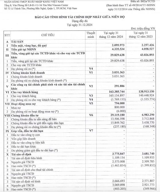 Tính đến cuối năm 2024, Eximbank sở hữu tổng tài sản đạt 239.768 tỷ đồng, tăng 19% so với đầu năm. Trong đó, tiền gửi tại các tổ chức tín dụng khác giảm 30%, lùi về mức 29.829 tỷ đồng. Dư nợ cho vay khách hàng đạt 165.154 tỷ đồng, tăng 18%.