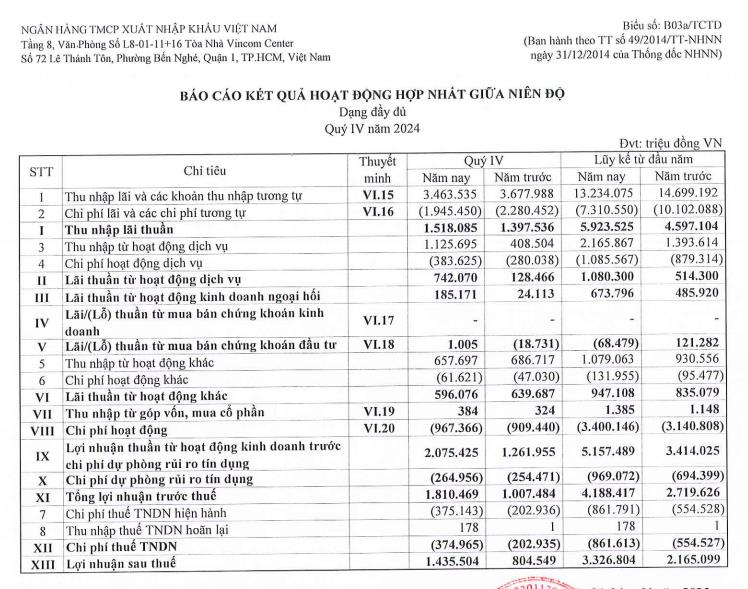 Theo Báo cáo tài chính hợp nhất quý IV/2024 của Ngân hàng TMCP Xuất nhập khẩu Việt Nam (Eximbank, mã ck: EIB), ngân hàng ghi nhận thu nhập lãi thuần đạt 1.518 tỷ đồng, tăng 9% so với cùng kỳ năm trước.