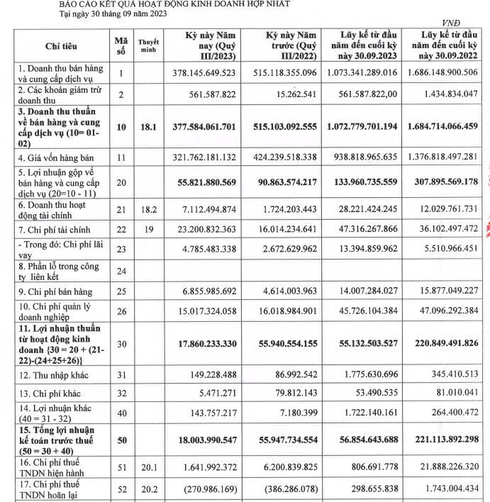 Trên bảng cân đối tài chính, tại ngày 30/9/2023, tổng tài sản của công ty đạt 2.425,6 tỷ đồng, tăng 14% so với đầu năm. Trong đó, tiền, khoản tương đương với tiền giảm 48,4% so với đầu năm, lùi về mức 121,2 tỷ đồng.