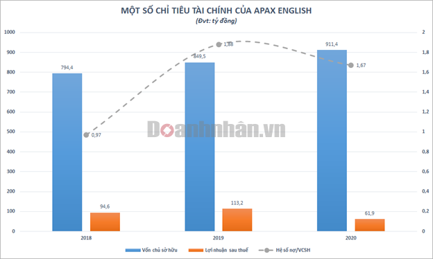 Năm 2020, lợi nhuận sau thuế của Apax Englis giảm gần một nửa so với năm trước, xuống mức 61,9 tỷ đồng do nhiều trung tâm phải đóng cửa trong thời gian dịch bệnh diễn biến phức tạp. Vốn chủ sở hữu lại tăng từ 849,5 tỷ đồng lên 911,4 tỷ đồng khiến tỷ suất sinh lời trên vốn chủ sở hữu (ROE) giảm mạnh xuống mức 6,8%.