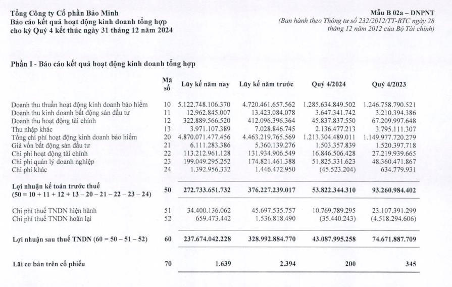 Tổng Công ty cổ phần Bảo Minh (mã ck: BMI) vừa công bố kết quả kinh doanh quý IV/2024.
