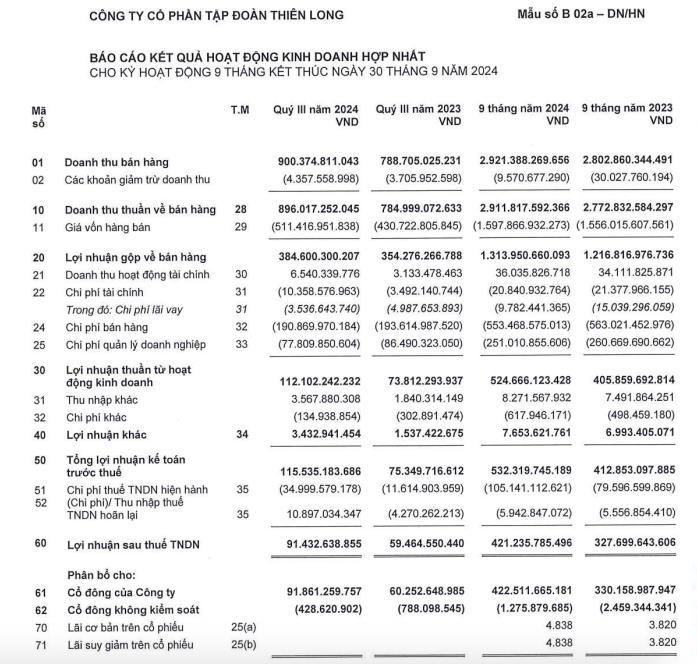 Lũy kế 9 tháng đầu năm 2024, Thiên Long ghi nhận doanh thu thuần đạt 2.911,8 tỷ đồng, tăng 5% so với cùng kỳ năm trước. Lợi nhuận sau thuế của công ty đạt 421,2 tỷ đồng, tăng 28% so với cùng kỳ 2023.