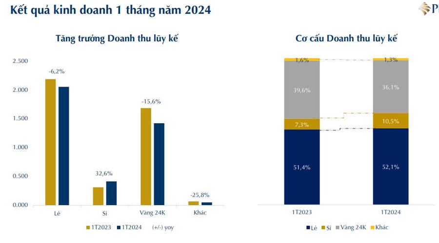 Tuy nhiên ngược lại, doanh thu trang sức bán sỉ bật tăng 33% nhờ lượng đơn đặt hàng chuẩn bị cho dịp Tết Nguyên đán tăng. Dù vậy, mảng bán sỉ chỉ đóng góp 11%. Cơ cấu doanh thu phần lớn là bán lẻ với tỷ trọng 52%, vàng 24K chiếm 36%, còn lại 1% là các loại khác.
