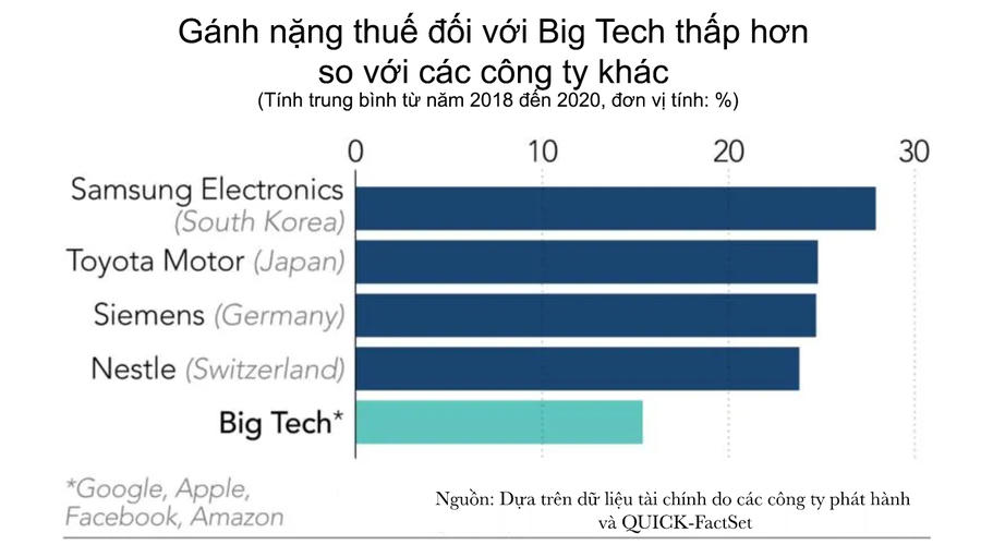 Một phân tích gần đây của Nikkei Asia cho thấy, tỷ lệ gánh nặng thuế trung bình đối với nhóm Big Tech rơi vào khoảng 15%, tương đương khoảng 60% mức trung bình trong số hơn 50.000 công ty lớn trên toàn thế giới.