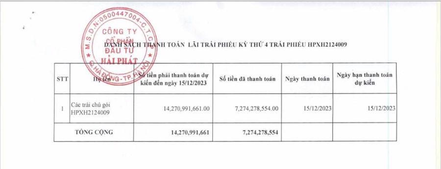 Ngày 15/12/2023, Công ty Đầu tư Hải Phát phải thanh toán 14,27 tỷ đồng tiền lãi cho trái chủ mã trái phiếu HPXH2124009 nhưng công ty chỉ thanh toán được 7,27 tỷ đồng, còn lại gần 7 tỷ đồng chưa thanh toán cho trái chủ.