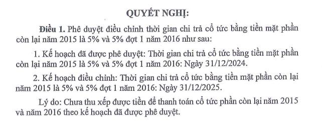 Hội đồng quản trị Công ty cổ phần Sông Đà 6 (mã ck: SD6) vừa phê duyệt điều chỉnh thời gian trả cổ tức bằng tiền mặt phần còn lại năm 2015 là 5% và 5% đợt 1/2016 từ ngày 31/12/2024 sang ngày 31/12/2025.