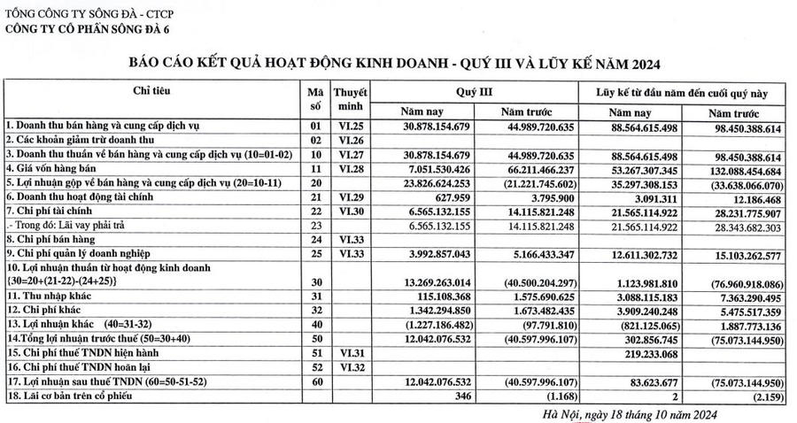 Doanh thu hoạt động tài chính chỉ vỏn vẹn đạt 3 triệu đồng, chi phí tài chính và quản lý doanh nghiệp đều giảm. Kết quả là, SD6 báo lãi 83,6 triệu đồng trong khi cùng kỳ năm ngoái báo lỗ hơn 75 tỷ đồng.