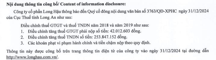 Công ty cổ phần Long Hậu (mã ck: LHG) vừa công bố nhận được quyết định của Cục thuế tỉnh Long An về việc điều chỉnh và truy thu các khoản thuế liên quan đến thuế giá trị gia tăng và thuế thu nhập doanh nghiệp. Quyết định này được ban hành vào ngày 31/12/2024, liên quan đến các kỳ thuế năm 2018 và 2019.