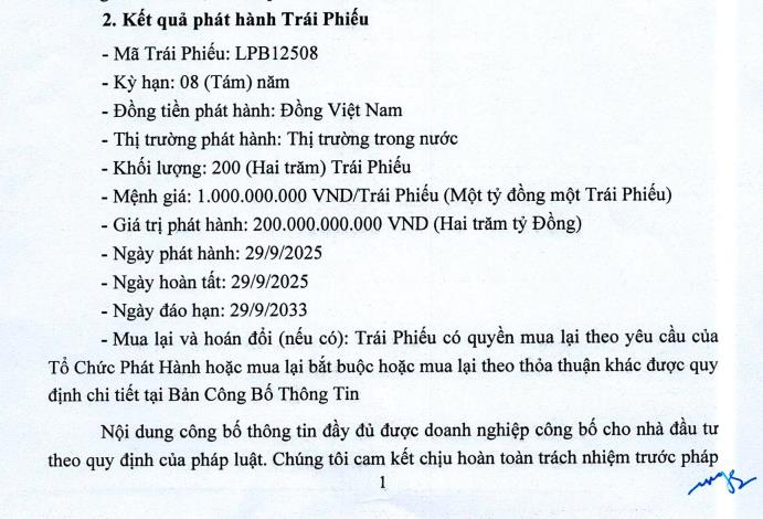 Theo đó, mã trái phiếu LPB12508 gồm 200 trái phiếu, mệnh giá 1 tỷ đồng/trái phiếu, qua đó huy động 200 tỷ đồng.