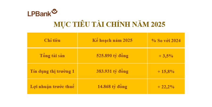 Theo tài liệu trình ĐHĐCĐ, LPBank đặt mục tiêu lợi nhuận trước thuế năm 2025 đạt 14.868 tỷ đồng, tăng trưởng 22,2% so với kết quả thực hiện năm 2024. Đây là một trong những mục tiêu tăng trưởng cao của ngân hàng trong vài năm trở lại đây, thể hiện sự tự tin vào chiến lược phát triển bền vững và thận trọng.