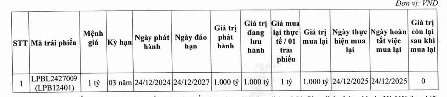 Ở chiều ngược lại, ngày 24/12/2025, LPBank đã thực hiện mua lại toàn bộ lô trái phiếu mã LPBL2427009 chỉ sau một năm phát hành, giá trị mua lại thực tế 1 tỷ đồng/trái phiếu.